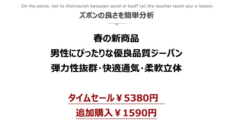 春の新商品 男性にぴったりな優良品質ジーパン 弾力性抜群・快適通気・柔軟立体 タイムセール¥5380円 追加購入¥1590円